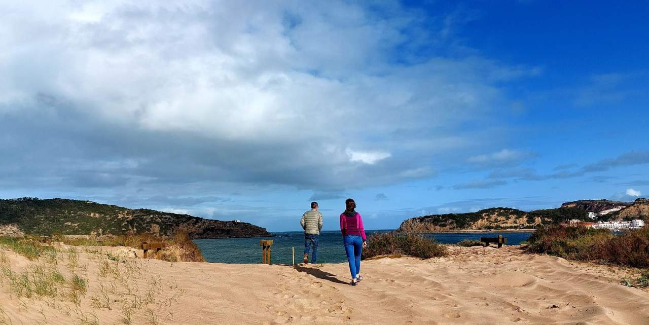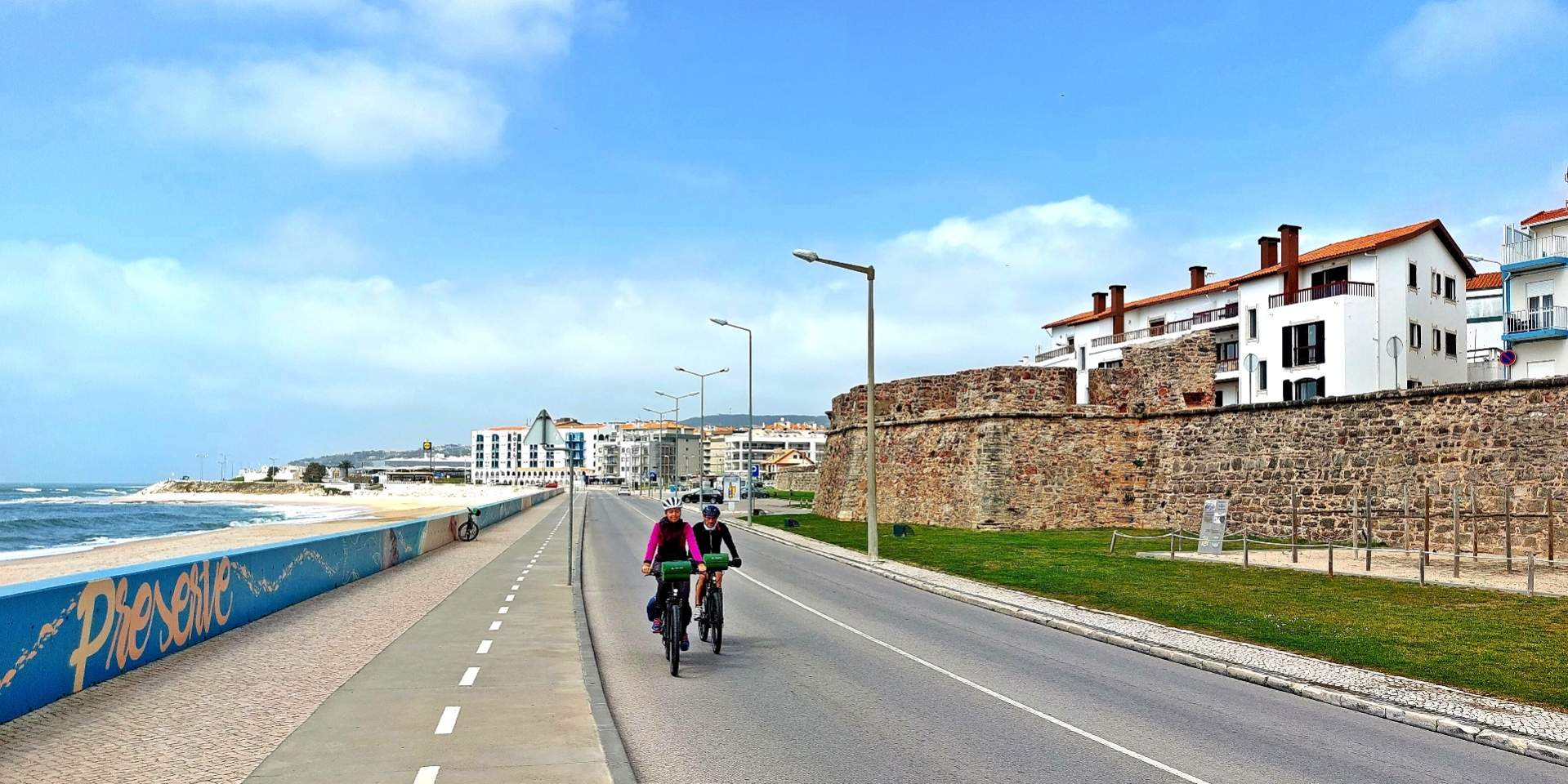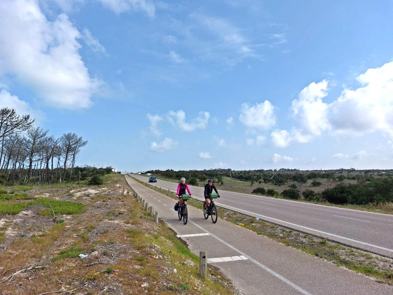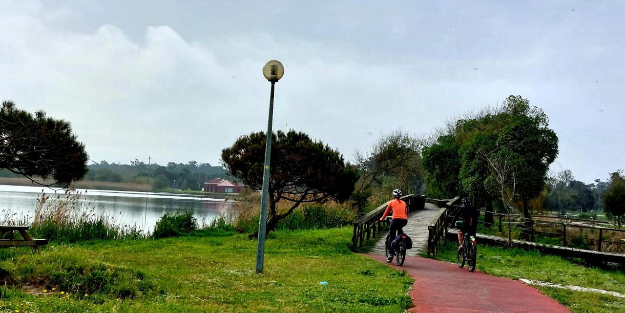 Pedalearemos próximos a algunos pequeños lagos, gozando de toda la fragancia aromática del entorno. Y en la Lagoa da Ervedeira nos detenemos a admirar sus mansas aguas, porque Flavio nos ha preparado un buen refrigerio. Al acabar, las pasarelas de su ribera nos conducen otra vez a la Estrada Atlántica hasta llegar a Pedrogão, que triplica sus habitantes en verano gracias a su playa kilométrica repleta de dunas que le dan un aspecto salvaje.
