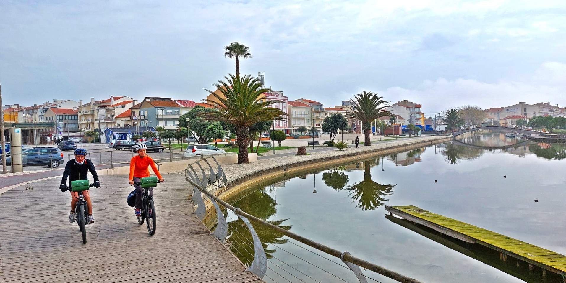 Con ilusiones renovadas comenzamos nuestro paseo de hoy pedaleando a la orilla del Canal de Ovar, una laguna litoral poco profunda que constituye el mayor de los tres canales principales de la ría de Aveiro. Nos hallamos en el cordón litoral que separa dicha ría del mar, lo que permite a los veraneantes, sin grandes desplazamientos, optar por el mar bravo o las aguas tranquilas de la ría. En el Km 11 de la ruta de hoy dejamos a nuestra izquierda el Ponte da Varela, que nos llevaría por carretera a Aveiro, pero Rita y Flavio tienen un plan mucho mejor para nosotros.