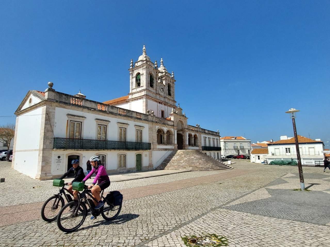 La siguiente meta volante la tenemos en la playa más conocida mundialmente quizás de todo Portugal, por lo menos entre los surfistas. Pero no queremos privarnos antes del espléndido espectáculo que se divisa desde el Sìtio de Nazaré, desde donde disfrutaremos de una de las más conocidas panorámicas de la costa portuguesa. En lo alto de esos 318 m de roca que cae en picado hacia el mar, nos encontramos la pequeña Ermita de la Memoria, en la que se cuenta la leyenda del milagro obrado por la Virgen al impedir que el caballo de un hidalgo cayese al vacío. Verdad o no, en el mirador de Suberco se puede ver la señal dejada en la roca por la herradura del corcel. Es pura magia contemplar cómo al atardecer la arena de la playa de Nazaré va cambiando de tonalidades a medida que el sol se oculta en el Atlántico. Junto al mirador se levanta un pequeño monolito con una cruz en la que se recuerda que Vasco de Gama acudió a rezar ante la imagen de Nossa Senhora da Nazaré antes de realizar su primer viaje a la India. Es esta una iglesia barroca en la que los azulejos cautivan a los miles de peregrinos y visitantes que le rinden homenaje continuo. La enorme plaza que la rodea y las múltiples tiendas de souvenirs sirven de marco a la estampa más turística de toda nuestra ruta.