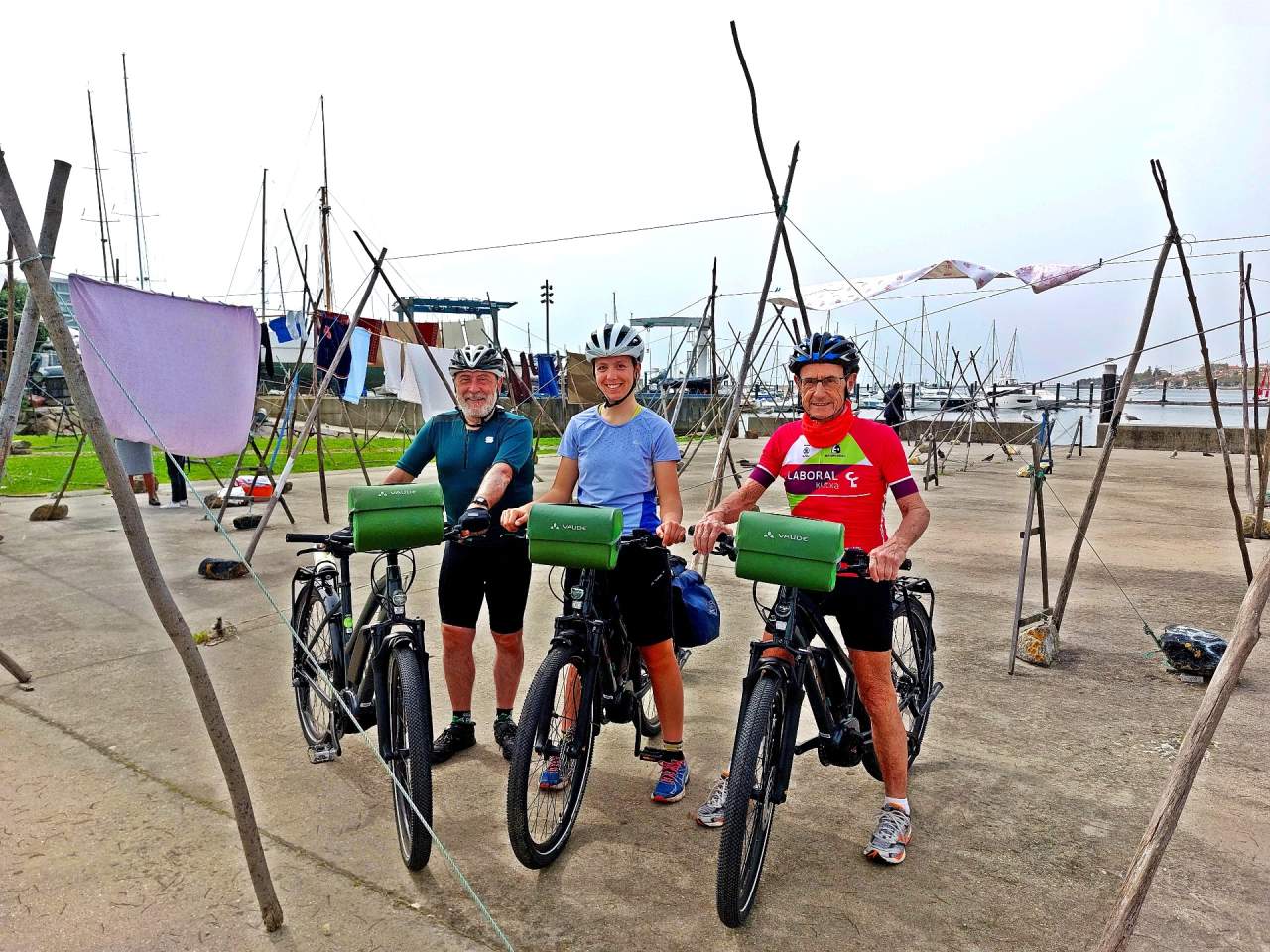 Poco después nos adentramos en la Reserva Natural das Dunas de São Jacinto, una zona con playa, dunas móviles y fijas, bosques de pinos silvestres y charcas de agua dulce, lugar de paso para aves acuáticas. Así llegamos al pueblo pesquero de São Jacinto, donde la sorpresa que Rita nos había anunciado está a punto de producirse: un ferry parece esperar nuestra llegada para cerrar su cadena de acceso e iniciar la travesía en 15 minutos de la ría de Aveiro. Las bicis navegan bien ancladas a popa y nosotros nos situamos a proa para que nuestra joven amiga nos vaya comentando todo lo que estamos viendo en esta desembocadura del río Vouga que configura la ría de la populosa e industrial localidad de Aveiro, comprobando que los tres canales entran ciudad adentro creando una división natural entre los barrios más antiguos y los más nuevos. No es de extrañar que algunos la llamen “la Venecia portuguesa”, aunque quizás resulte un tanto exagerado ese nombre. Nosotros optamos por dejar la visita de esta ciudad para otra ocasión, con miedo de que el encanto de nuestra ruta pueda perderse entre el bullicio y el tráfico de la urbe.