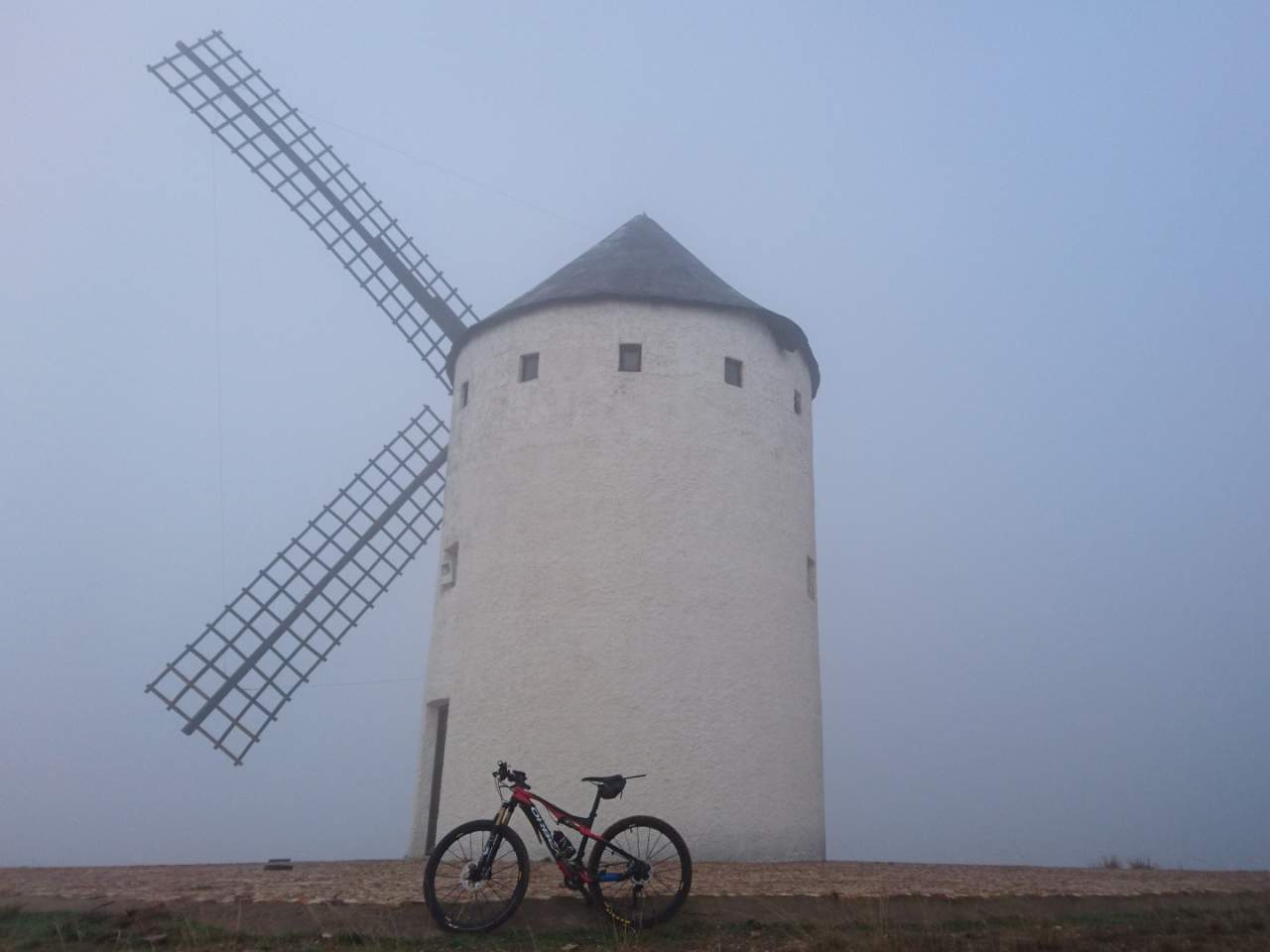 La niebla me acompaña. Luego de dejar atrás Herencia, el destino es Alcázar de San Juan. Ahí están. Los gigantes. ¿Son de verdad? Quietos, inmóviles hasta el extremo, fantasmas de otra época. El primero comienza a dibujarse allá arriba. Se muestra como un imán hacia el que no queda sino acercarse. En silencio. La niebla y el silencio. Nadie alrededor. Él, yo y la bici. Ni rastro de Sancho Panza. Tampoco se ve al caballero andante. El primer encuentro siempre marca. Alcázar de San Juan son sus molinos en la niebla. Sus gigantes silentes.